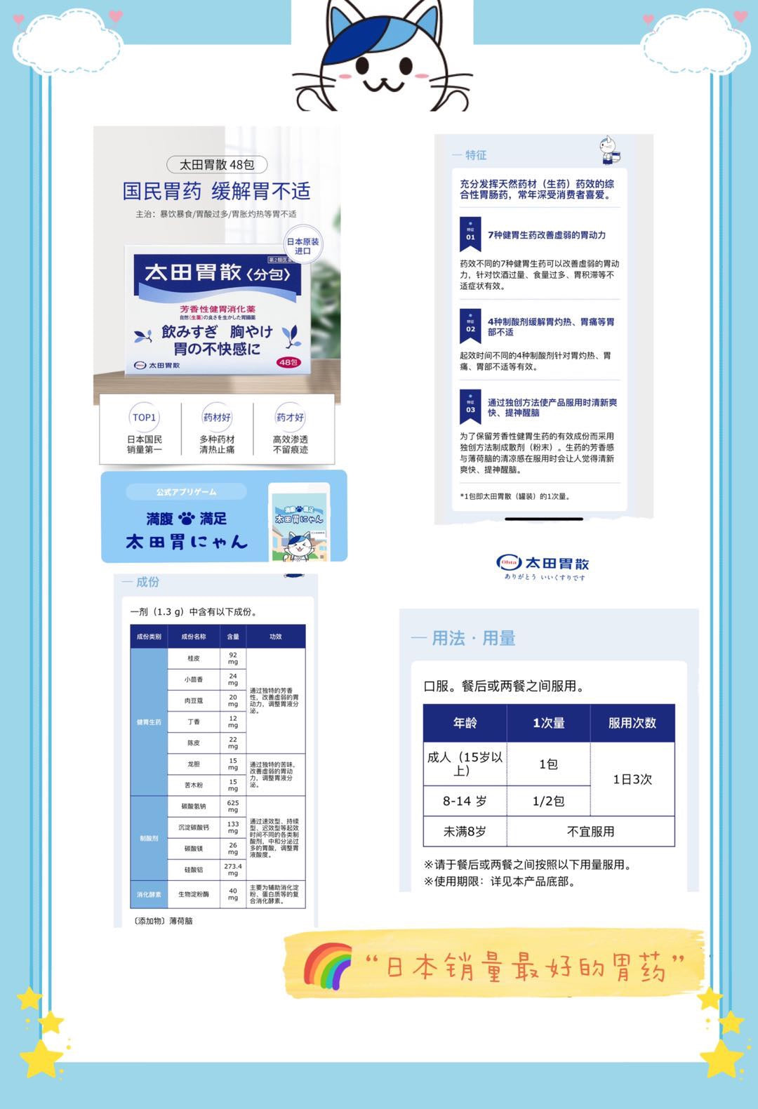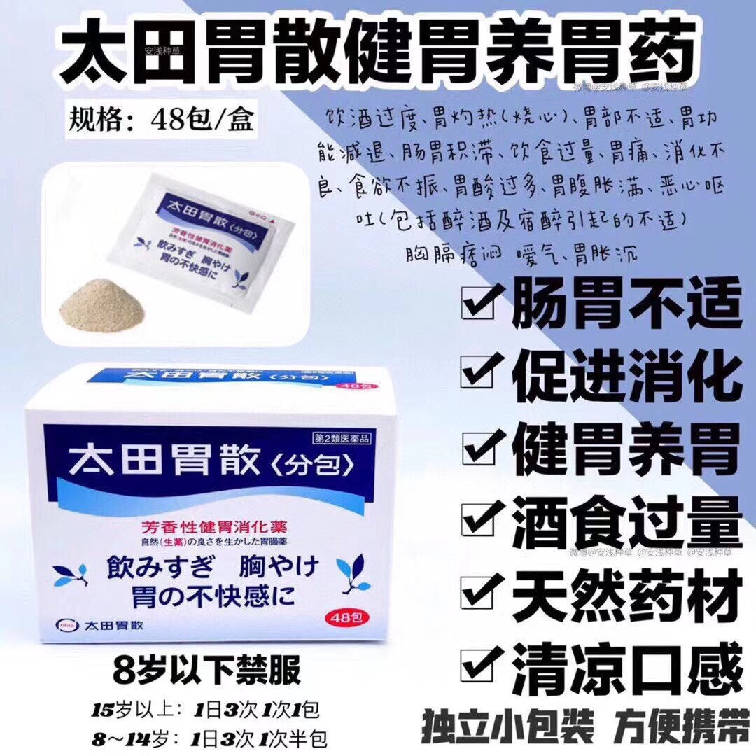 日期新鲜,48包,超大容量,非常划算,🇯🇵太田胃散日本最有名的胃药吃太饱撑了、醉酒宿醉、胃不适都能对付,主治:酒食过量,胃灼热,胃积滞,胃酸过多,胃胀痛。